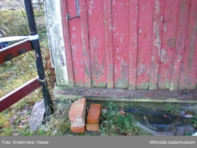 Väggdetalj av det rödmålade Månstorpet, Sjövalla 1:118, i Mölndal. Fotografi taget den 9/11 2007. Byggnadsdokumentation inför rivning.