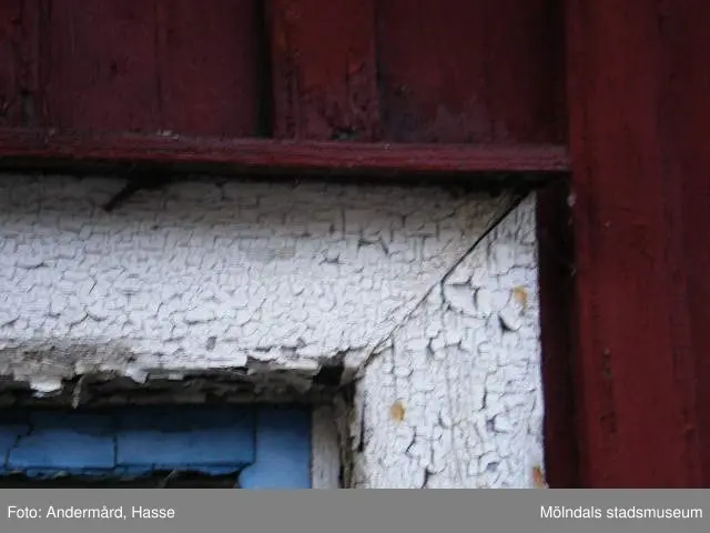Detalj av fönster till det rödmålade Månstorpet, Sjövalla 1:118, i Mölndal. Fotografi taget den 9/11 2007. Byggnadsdokumentation inför rivning.