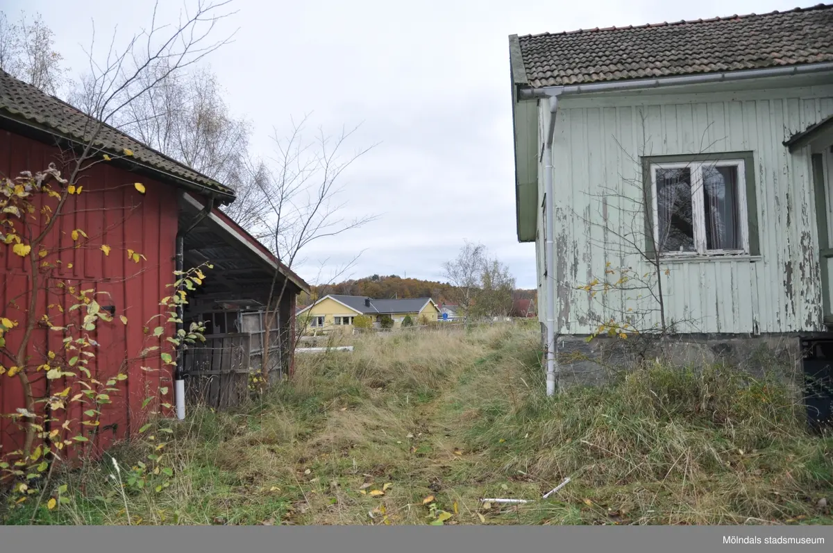 Ekonomibyggnad och bostadshus på fastigheten Ranntorp 2:20 i Ranntorp, Lindome, i Mölndals kommun. Fotografiet är taget den 22/10 2014. Byggnadsdokumentation inför rivning.