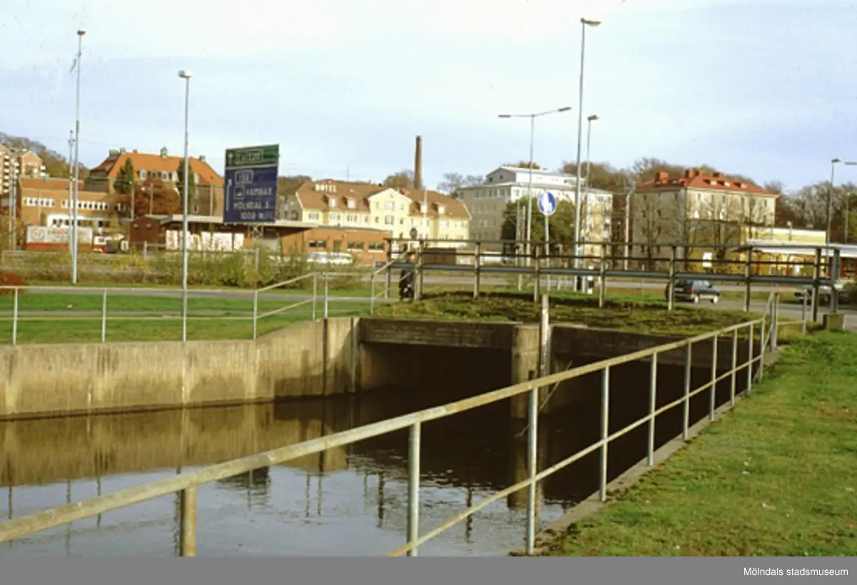 Kulvert i Mölndalsån utmed Göteborgsvägen, oktober 1993. Vy från Göteborgsvägen snett över E6/E20 mot sydost. I bakgrunden från vänster ses bl a Mölndals brandstation, Kvarnbyskolan, Hotel Mölndals Bro samt två kontorsbyggnader.