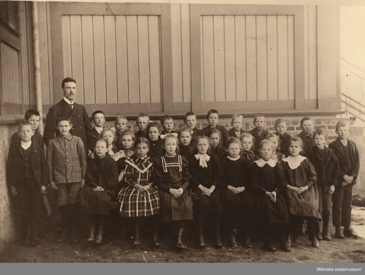 Johan Lundskog med skolklass på Kärra skola. Framför läraren står Algot Alminger (givarens morbror).