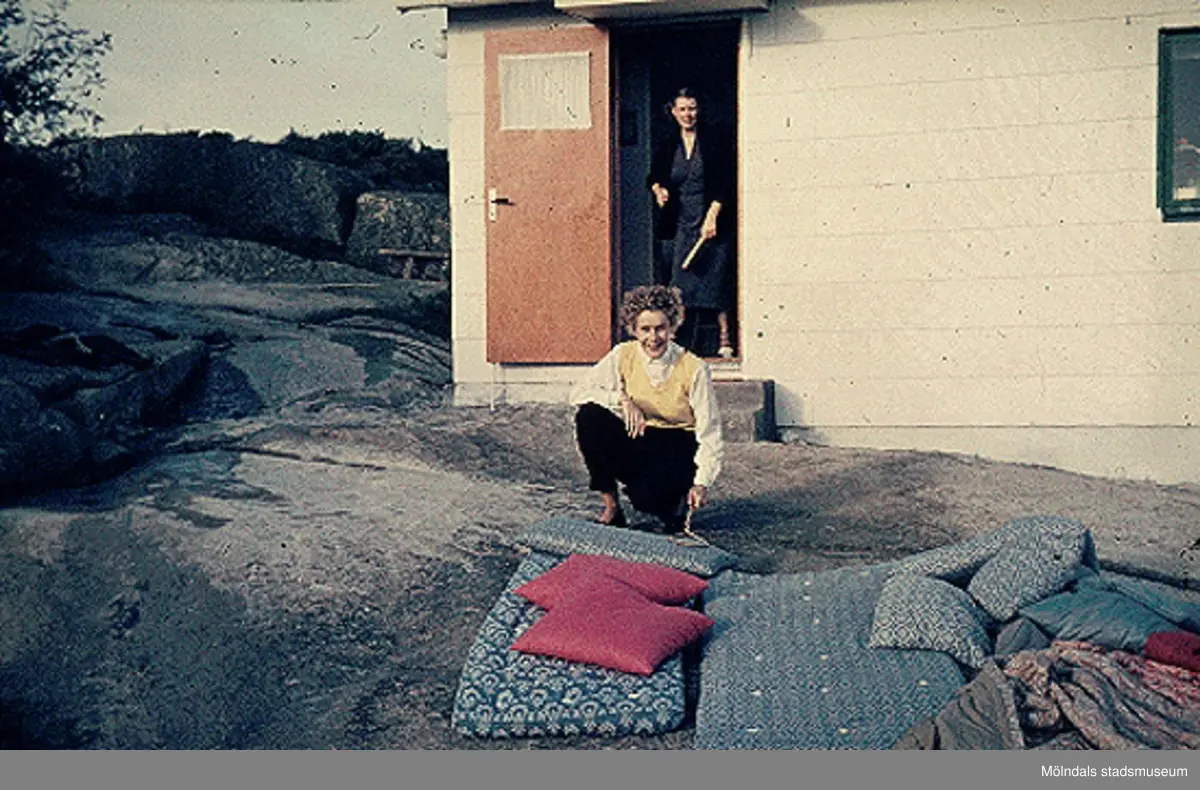 Greta och Karin Gustafsson skakar mattor vid sommarstugan på Valebergsvägen i Näset, 1956.