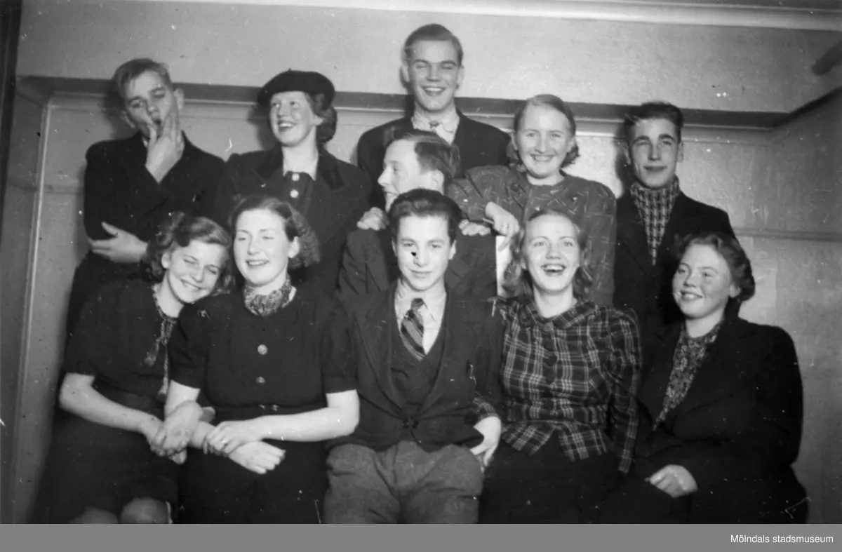 Studiecirkel i Krokslätt 1932. Troligtvis inom hyresgäströrelsen eller SSU. Elva personer, blandat män och kvinnor, som sitter och står utmed en vägg. Damen på översta raden , 2:a från höger, kallades "Överlida".