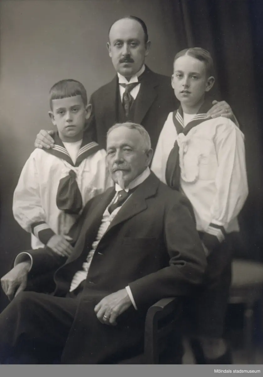 Jean O. Erikson senior (1833-1921) sittande med sin son Jean O. Erikson junior och sina sonsöner Bror (född 1904) och Carsten (född 1901) bakom sig. Sonsönerna tog sig senare namnet Hvistendahl. Familjen var ägare av Göteborgs Jästfabrik.