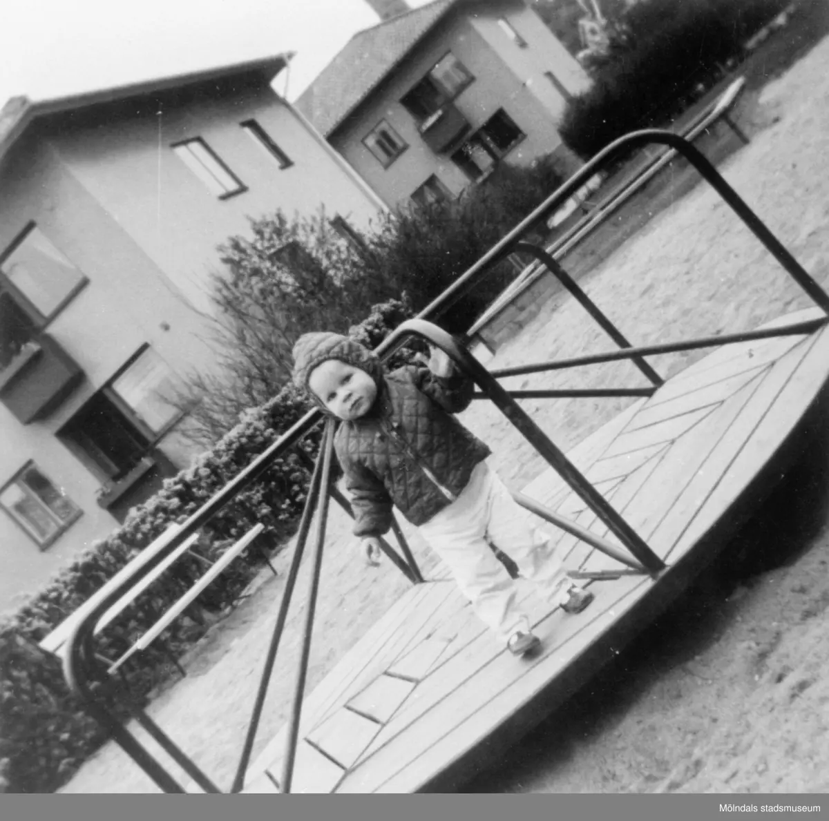 Ett litet barn ståendes i karusell i en lekpark, 1965. Brunnsgatan 4 och 6 syns i bakgrunden.