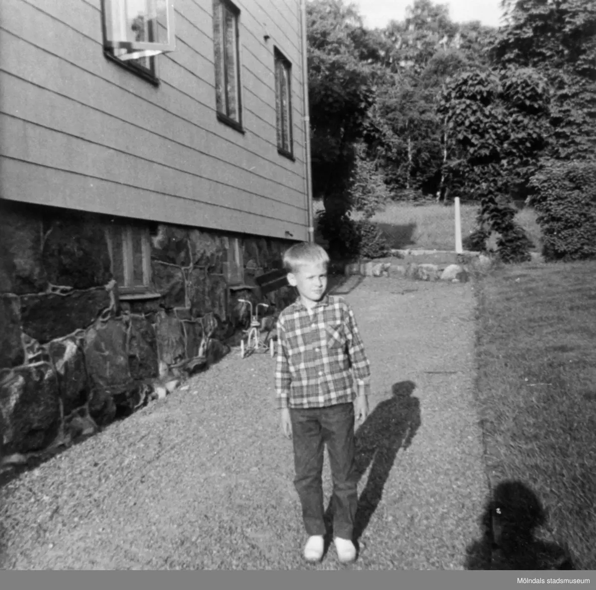 En pojke står på gruset utanför huset. I bakgrunden intill väggen syns en trehjuling. Brunnsgatan 9, 1965