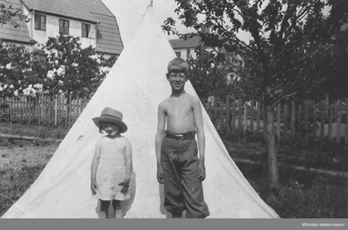 Syskonen Lillemor (givarens mor) och Lasse tältar framför huset på Barnhemsgatan 13, 1930-talets början.