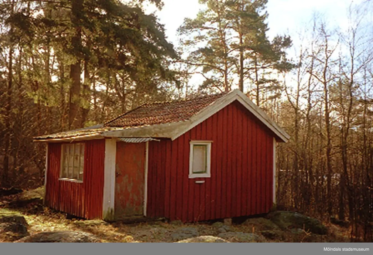 Fritidshus med skog runt omkring. Annestorp 1:17, Annestorp i Lindome februari 1995. Rivet 1995.