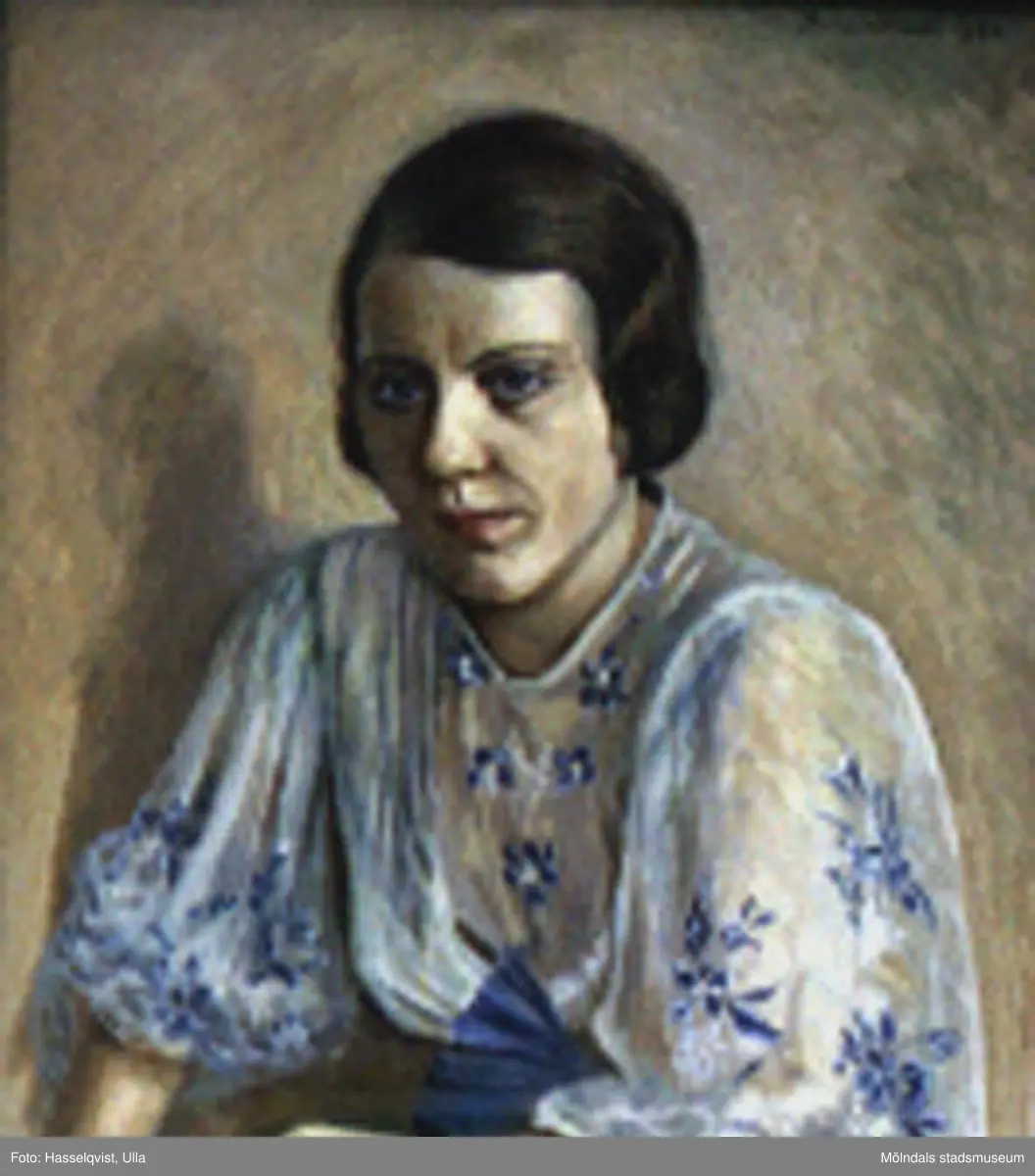 Målning utförd av Teodor Lindbäck, Lindome, 1934. Olja på duk. Porträtt av Margit Hult, f, Johansson 1910. Margit flyttade till Bräckavägen i Lindome 1934 och sökte upp Lindbäck, då hon själv var intresserad av konst. De målade tillsammmans. Margit äger tavlan.