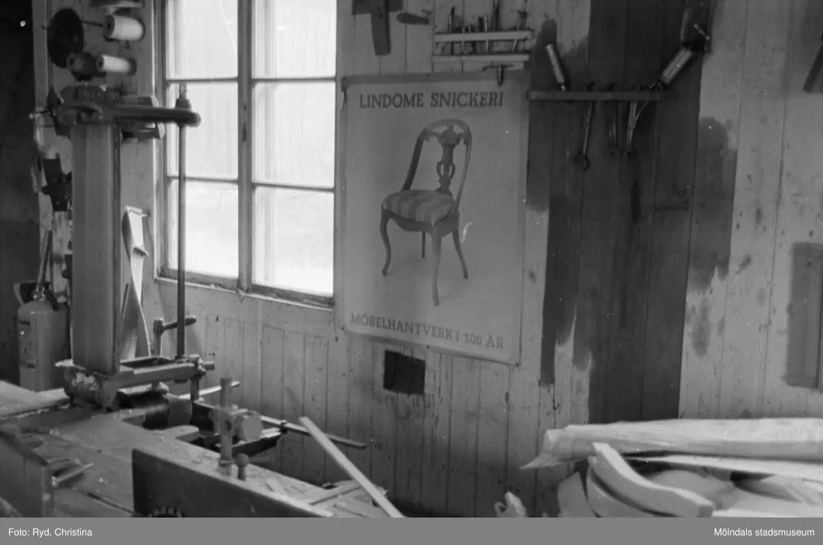 Insidan av snickeriverkstaden vid Skräppholmen 2:13 i Lindome, 1991.