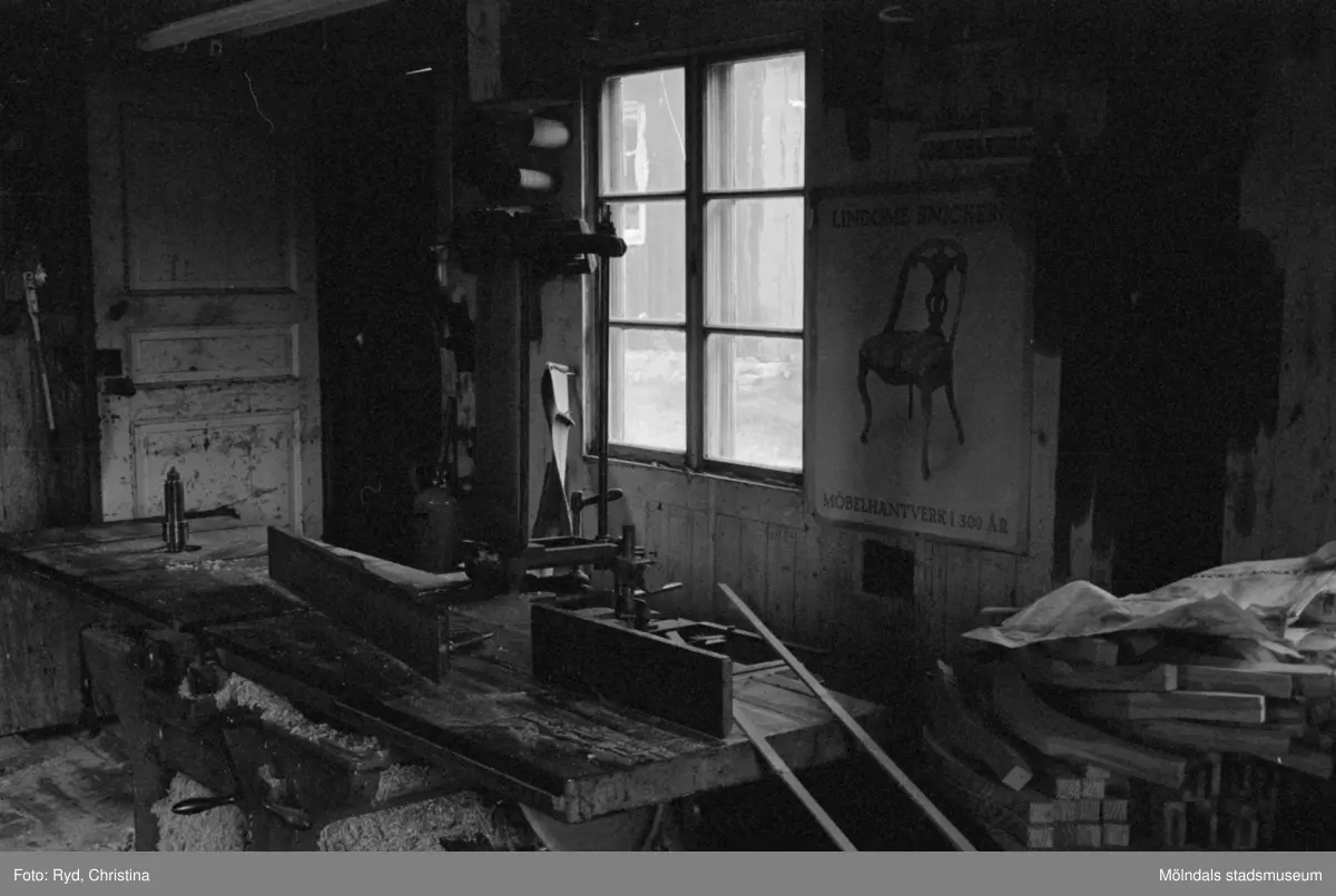 Insidan av snickeriverkstaden vid Skräppholmen 2:13 i Lindome, 1991.