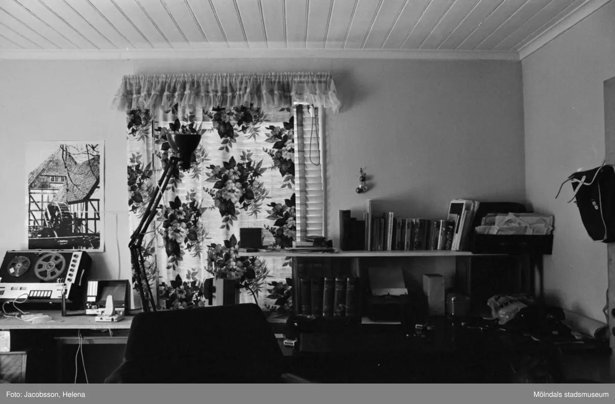 Bostadshus Roten M 11-12, okänt årtal. Ett hobbyrum med ett skrivbord, bandspelare, böcker osv.