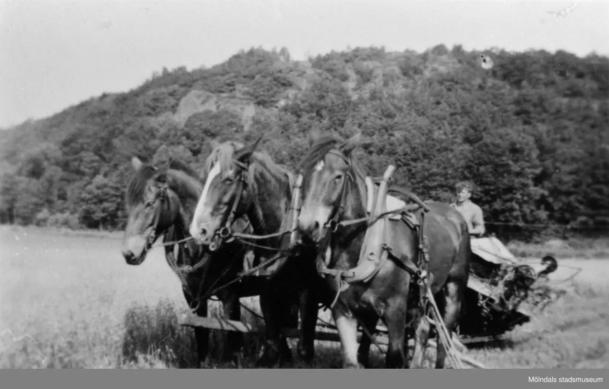 3 st. Nordsvenska hästar drar ett slåtteraggregat på Ersgårdens ägor, 1930.