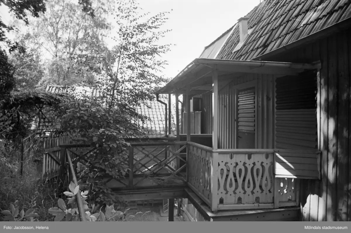 Kvarnfallet 24 vid Götaforsliden i Mölndals Kvarnby. Mangårdsbyggnad till kvarn (bostad). Veranda: snickeridetaljer med "gångbro" över till upphöjd gångbana.