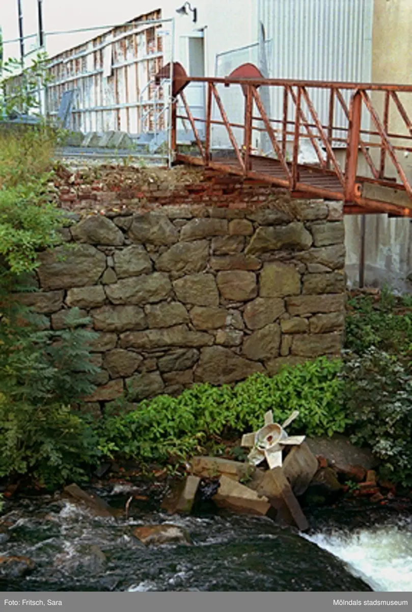 En stenmur och en spång över forsen i Mölndals Kvarnby, 1996.