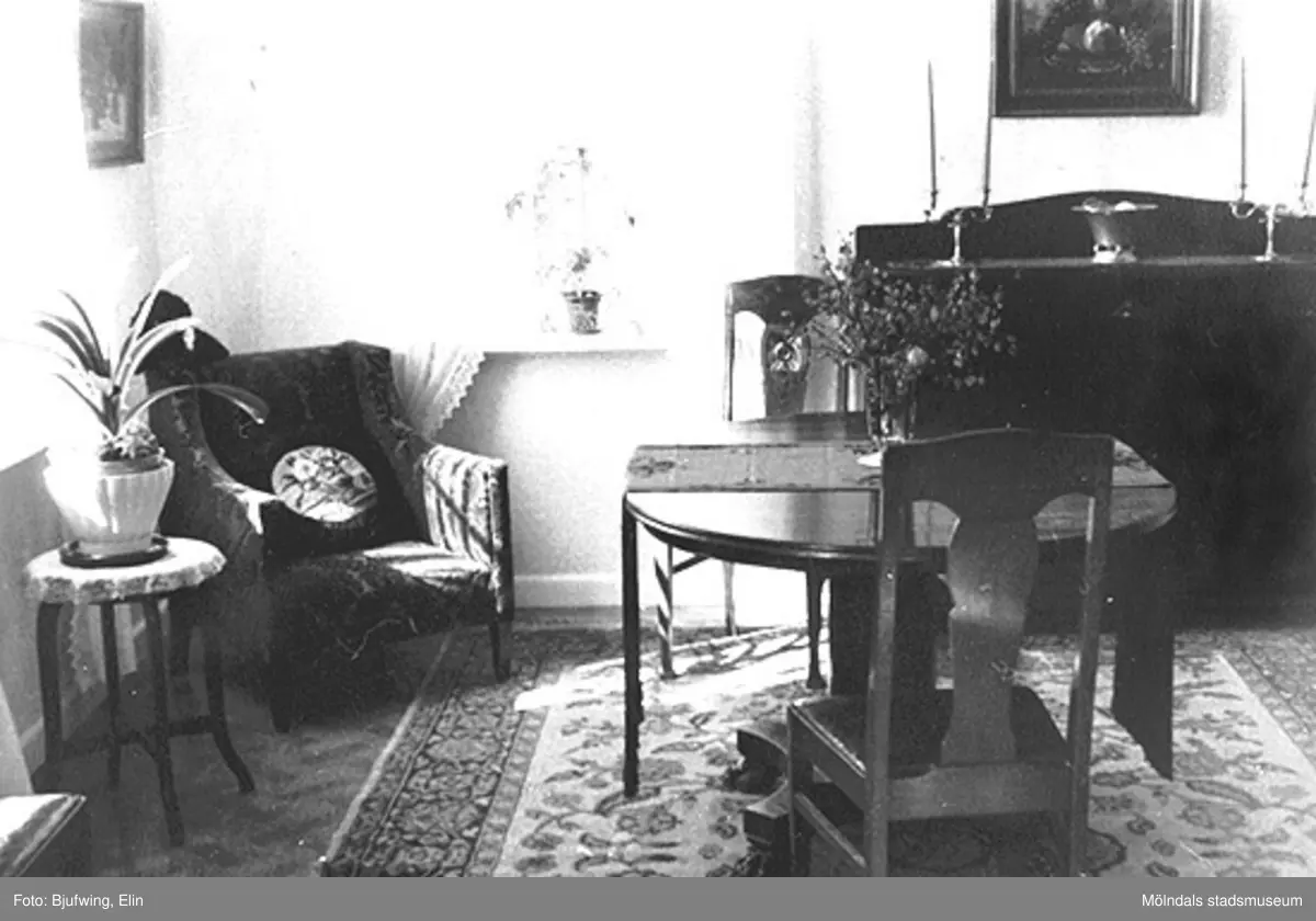 Finrummet, cirka 1940, hos familjen Oskar Andersson. På bordet ligger en broderad silkesduk med fransar.