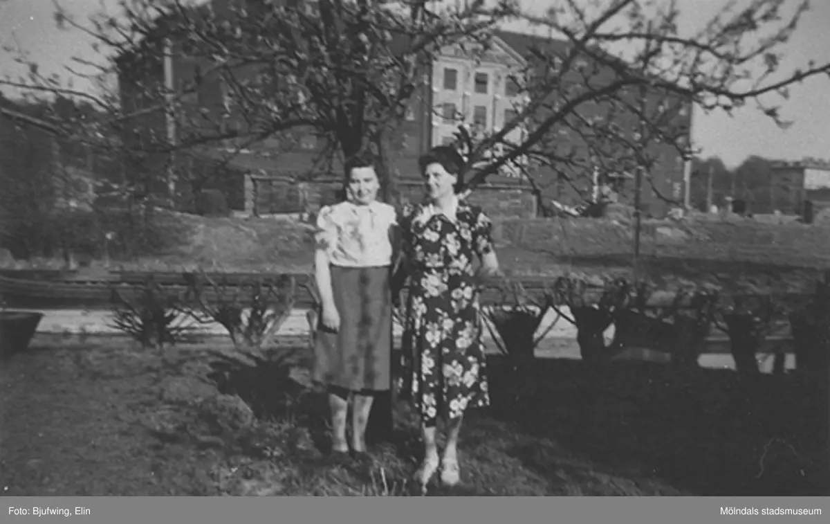 Elisabet Stam Andersson till höger. I bakgrunden Svallövsbolaget, 1940-tal. Fotografen Elin var lillasyster till Oskar Andersson, givaren Brittas morfar.