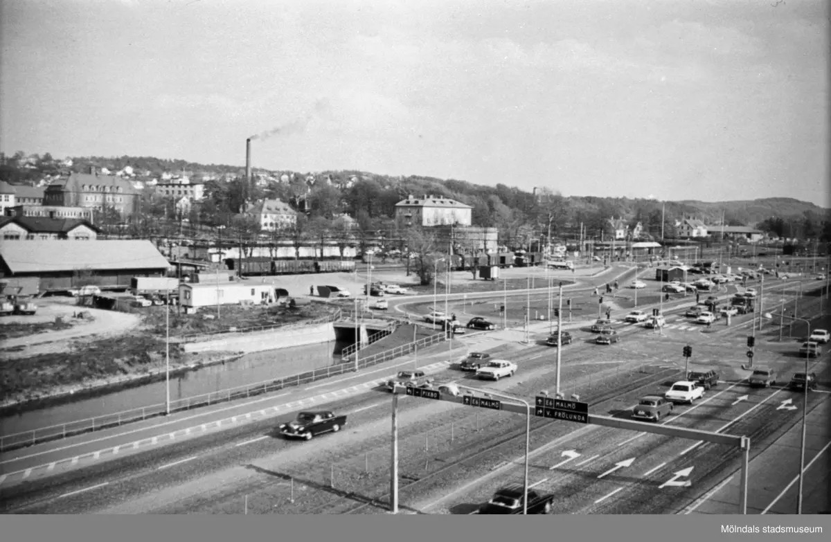 Mölndals nedre med spårvagnsspår, bilväg, järnväg och kulverteringen av Mölndalsån, innan motorvägen och bron byggdes. Skorstenen står på Papyrus-området. Utsikt från Folkets hus mot sydost, 1960-tal.