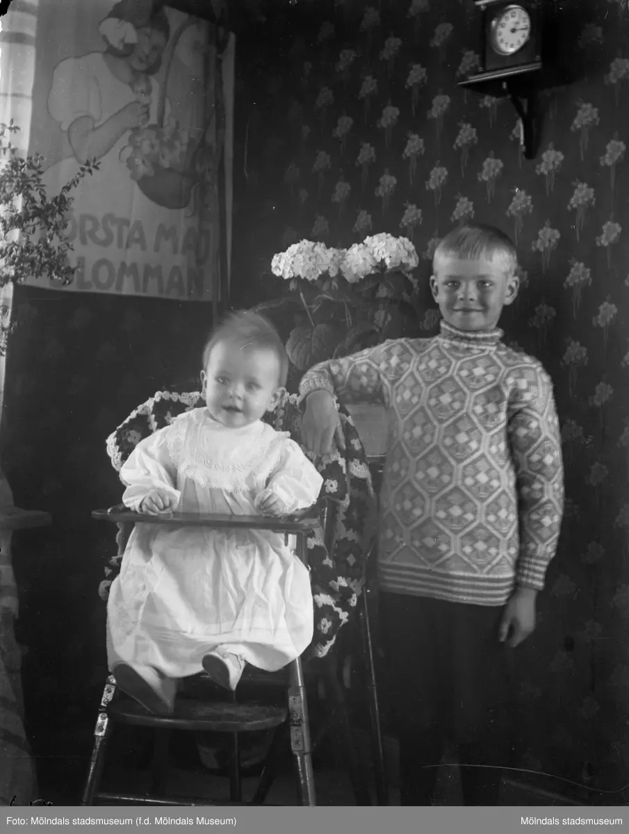 Två barn i ett möblerat rum, troligtvis 1920-30-tal. Det minsta barnet sitter i en barnstol och bredvid står en pojke.
