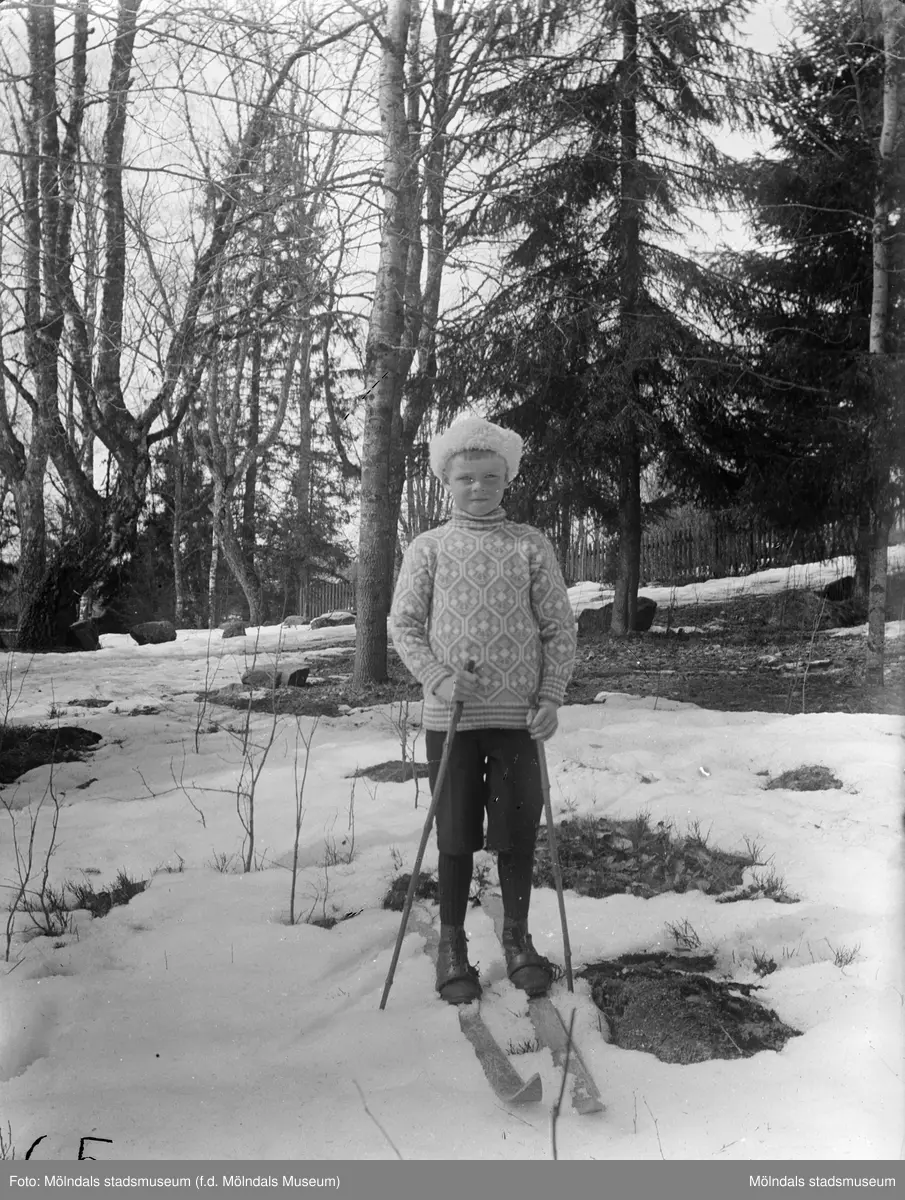 En pojke står på ett par skidor i en skog, troligtvis 1920-30-tal. På marken ligger snö. Det är samma gosse som 2018_0100.