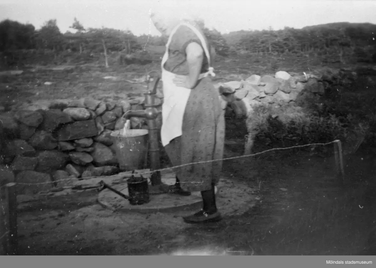 Elisabeth Andersson pumpar upp vatten för hushållsbruk, 1935.