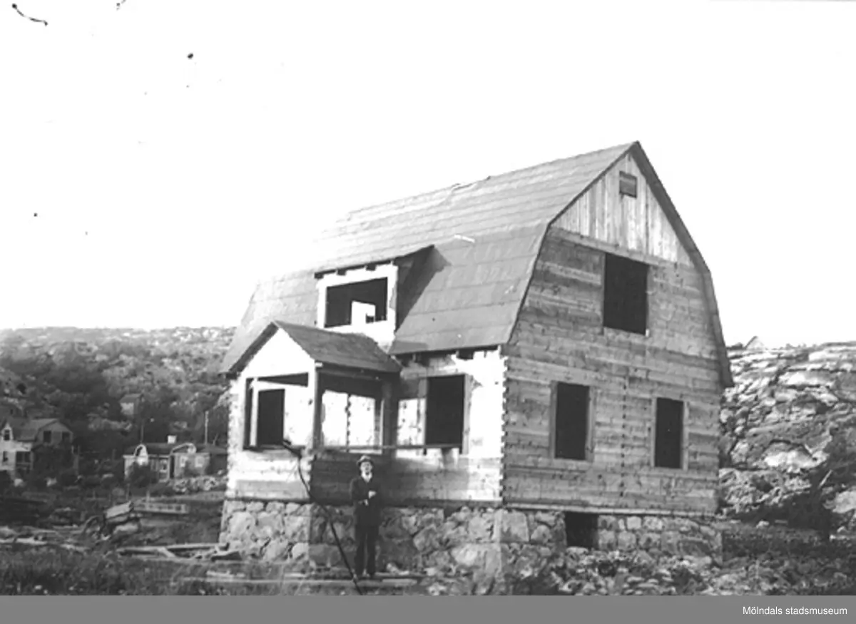 Fässbergsgatan 31 i Toltorpsdalen, Mölndal, ca 1923. Ett hus under byggnation.