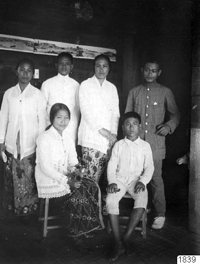 Walter Kauderns minahassiska tjänstefolk. Stående i mitten kocken och hans hustru, de övriga deras släkt eller vänner. Trakten av Tondanosjön, Minahassa. W. Kaudern:" I Celebes obygder". I. Sthlm 1921. Bild 65, p. 185.