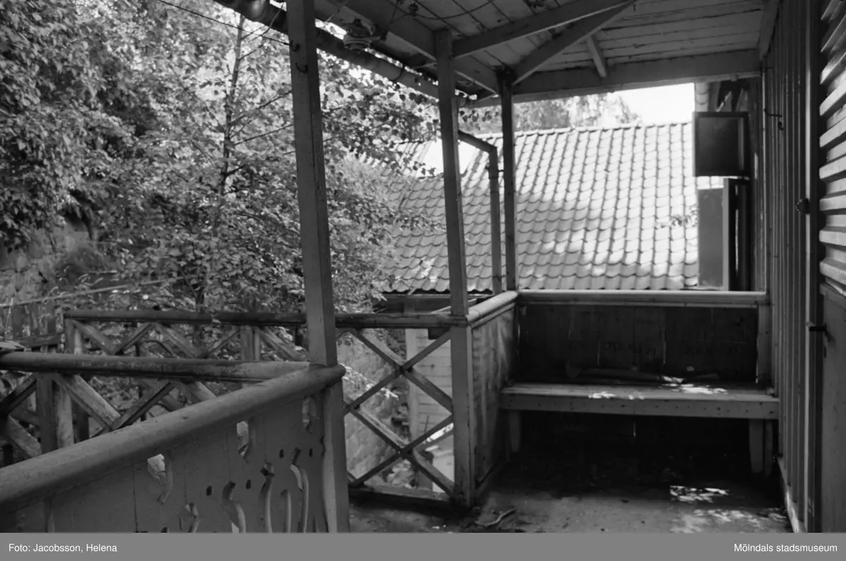 Kvarnfallet 24 vid Götaforsliden i Mölndals Kvarnby. Mangårdsbyggnad till kvarn (bostad). Veranda: snickeridetaljer med "gångbro" över till upphöjd gångbana.