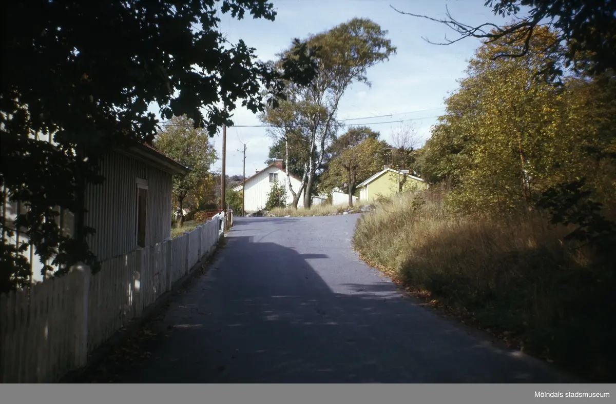 Vy från Ormåsgatan i Mölndal, 1970-tal. Skräddaregatan går in till höger lite längre fram.