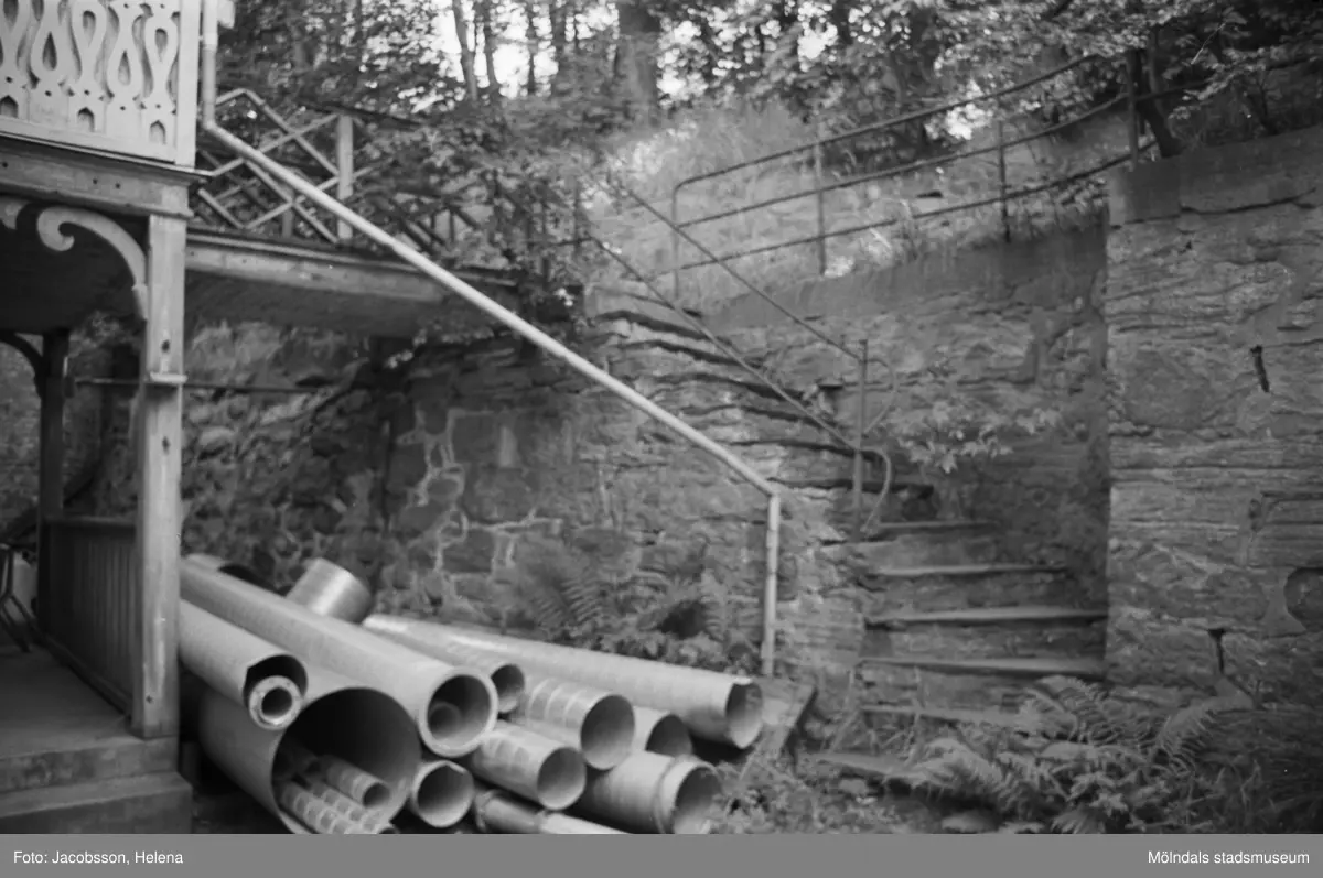 Titel: Kvarnfallet 24 vid Götaforsliden i Mölndals Kvarnby. Mangårdsbyggnad till kvarn (bostad). Veranda: snickeridetaljer med "gångbro" över till upphöjd gångbana.