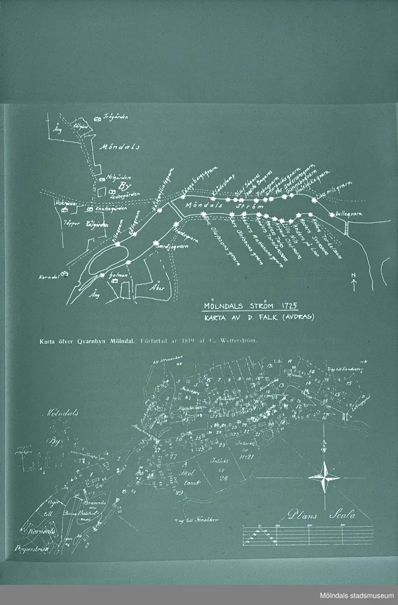 Karta som visar Mölndals mjölkvarnar år 1725. Illustration i Helena Jakobssons bok om Mölndals Kvarnby från 1972.
