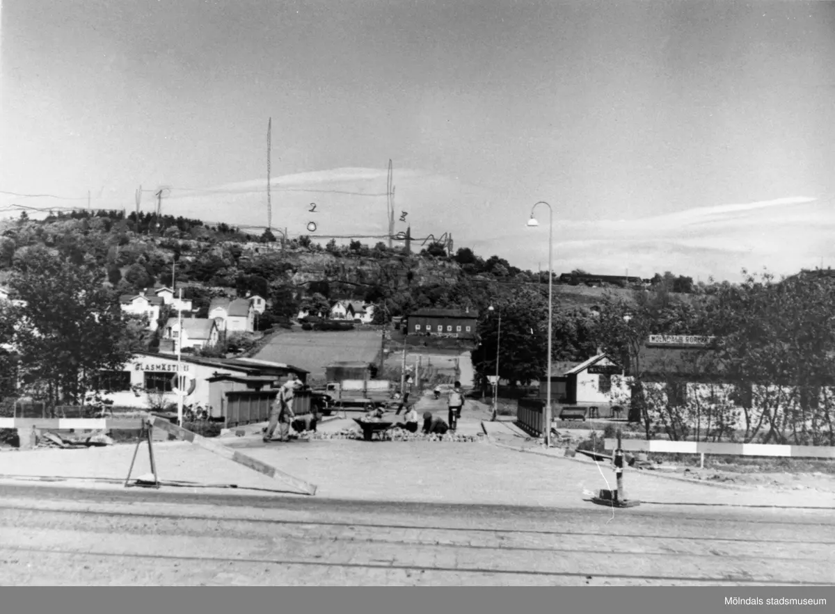 Bron lagas mellan Göteborgsvägen och Ågatan, 1950-tal. I bakgrunden ses området Trädgården. På Ekekullen (Delbancogatan och Lövgatan) ovanför är nya hus skissade med blyerts (siffror visar var). Dessa hus var färdiga 1964.