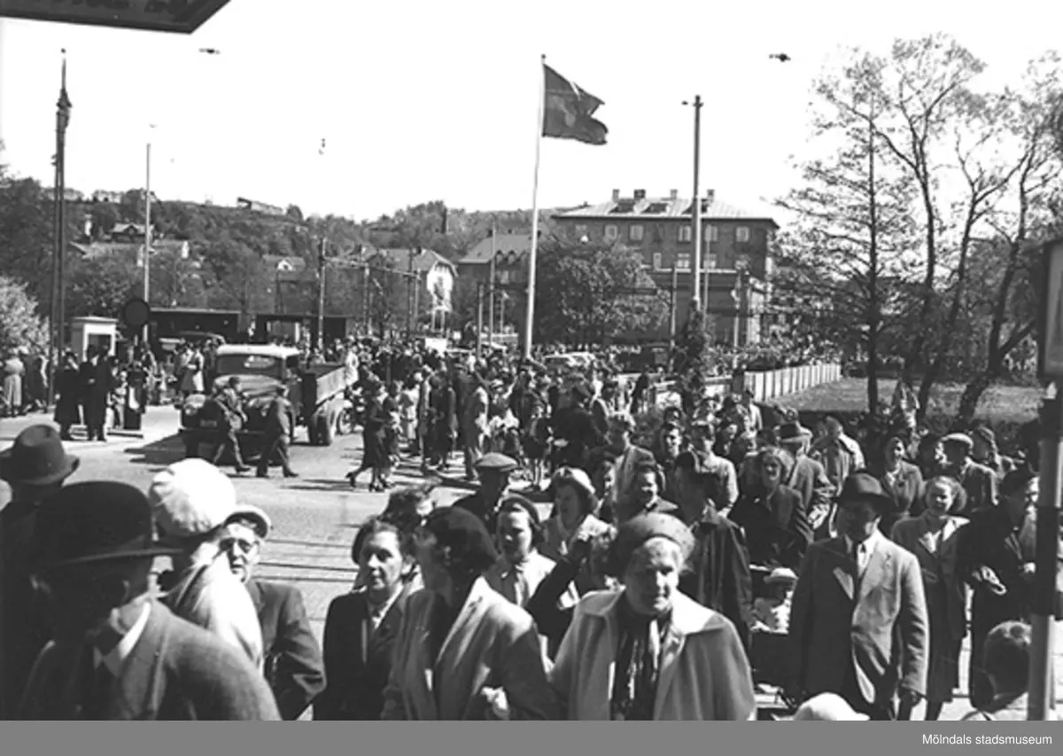 Publik inför Kung Gustav VI Adolfs (1882 - 1973) besök, som inviger och firar Gunnebo slott den 16 maj 1952 i Mölndals centrum. I bakgrunden ses järnvägsövergången på Kvarnbygatan i Mölndalsbro.