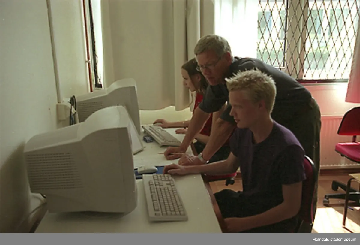 En lärare och två elever framför två datorer på Fässbergsgymnasiet, cirka 2002.