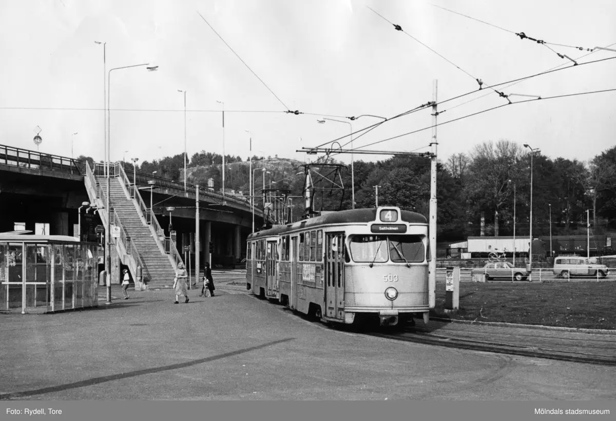 4:ans spårvagn vid spårvägens vändslinga på Broslätt i Mölndal.