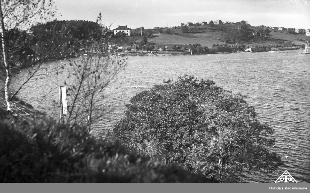 Vy över del av Stensjön i Mölndal. I fonden ses Strandpromenaden och Stensjöhills fasad mot sjön.