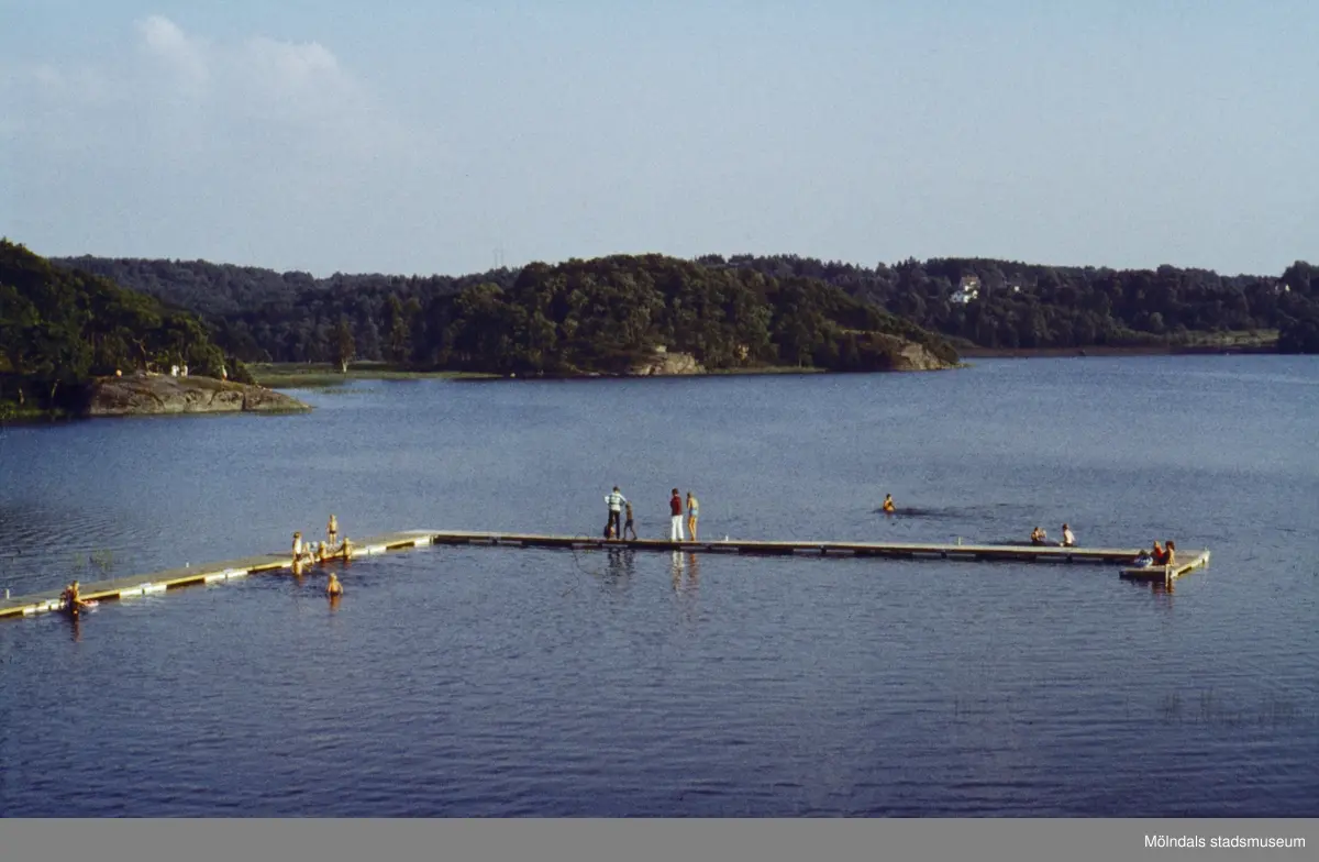 Badplats vid Stensjön i Mölndal på 1970-talet. På andra sidan sjön ses till vänster Lilla Berg och i mitten Hökekullen.