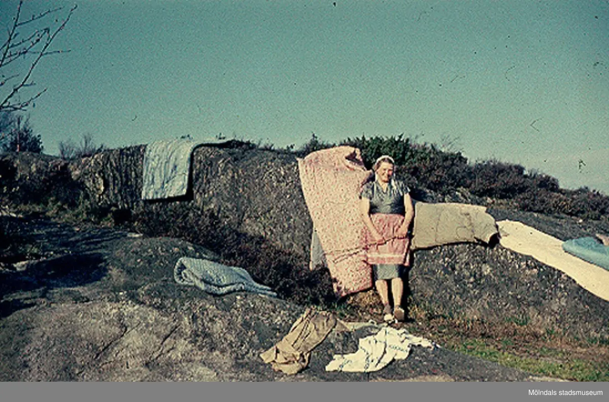 Greta eller Karin Gustafsson skakar mattor vid sommarstugan på Valebergsvägen i Näset, 1957.