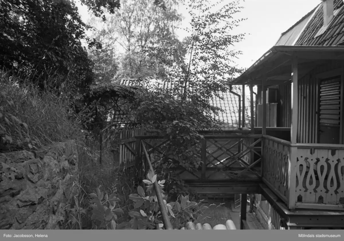 Kvarnfallet 24 vid Götaforsliden i Mölndals Kvarnby. Mangårdsbyggnad till kvarn (bostad). Veranda: snickeridetaljer med "gångbro" över till upphöjd gångbana.
