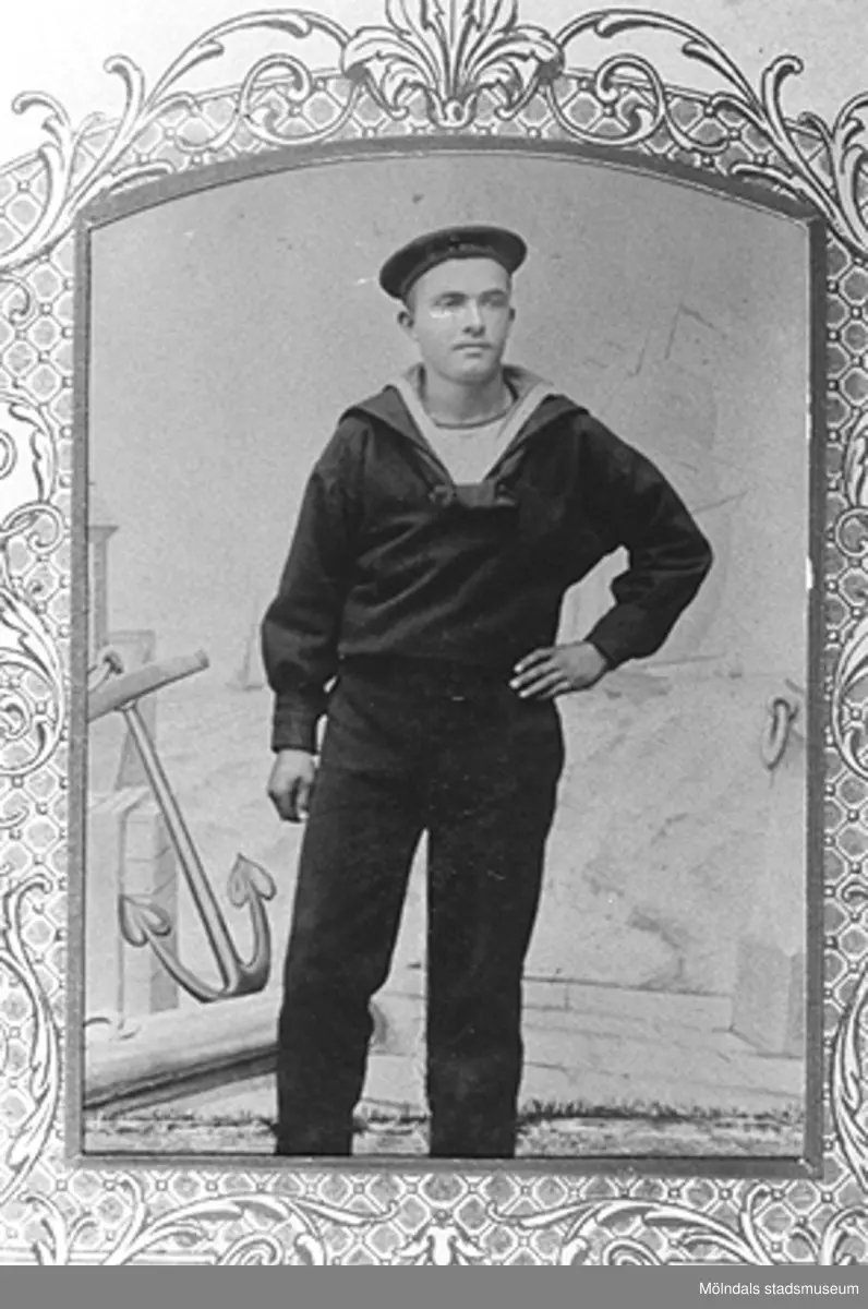 Carl Krantz poserar klädd i sjömanskläder, Fjällbacka år 1900. Troligtvis är det uniformen för militärtjänstgöring vid flottan.