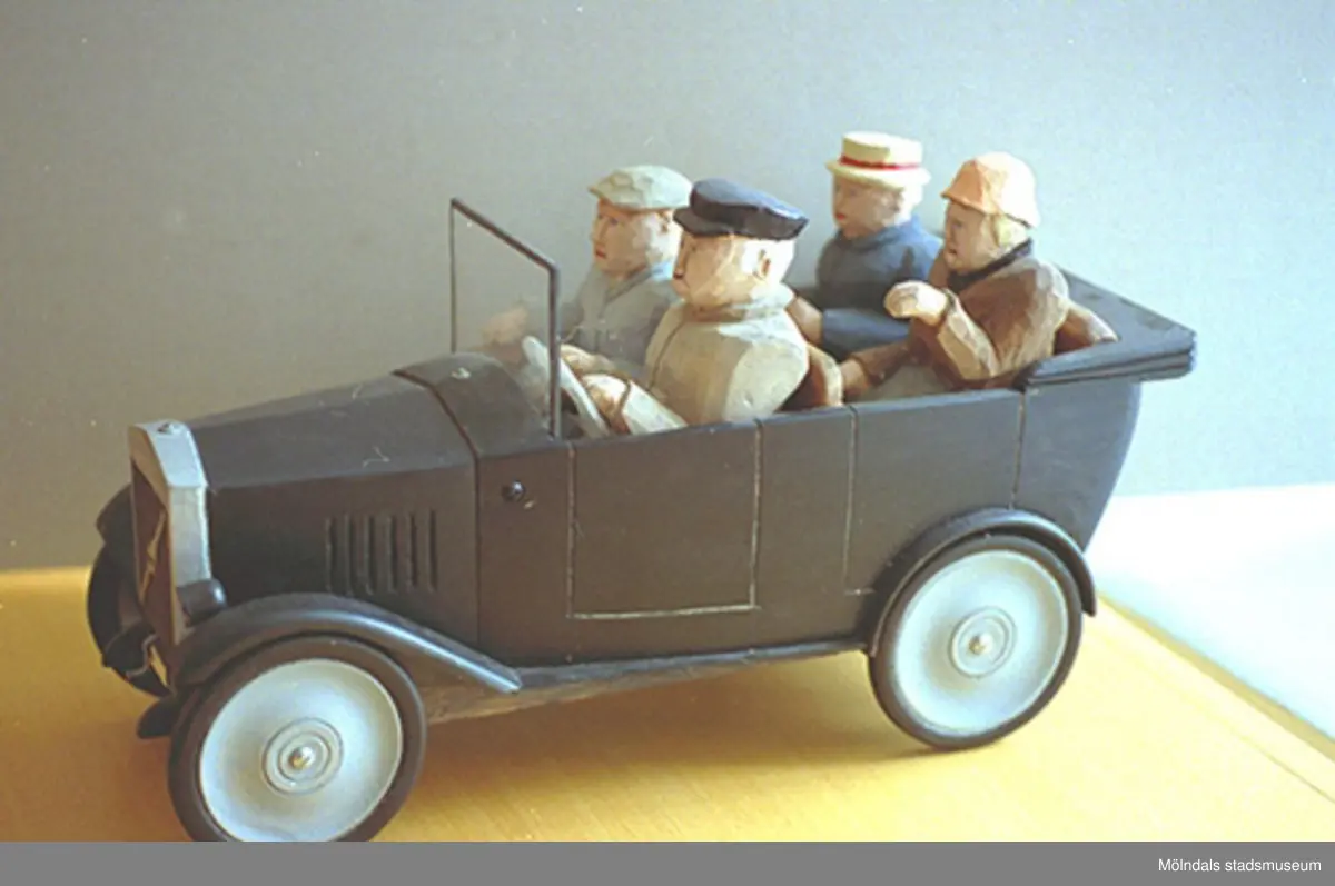 Fyra personer åker i en bil. Två personer sitter fram och två bak. Bilen, modell T-Ford, är mörkgrå och saknar tak. Däcken är ljusgrå. Man ser ekipaget snett från sidan. Hör ihop med bild nr 1994_0959. Harry Bergmans "gubbar" (träfigurer).