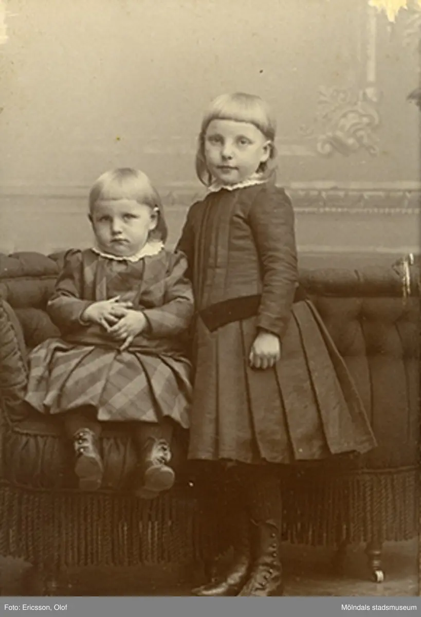 Bilden ett helfigursporträtt av två barn, taget i ateljé runt 1895-1905.