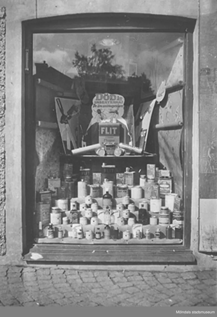 Skyltfönster med kemikalier, färger och insektsmedel. E. & K. Karlssons järnhandel, 1950-tal.