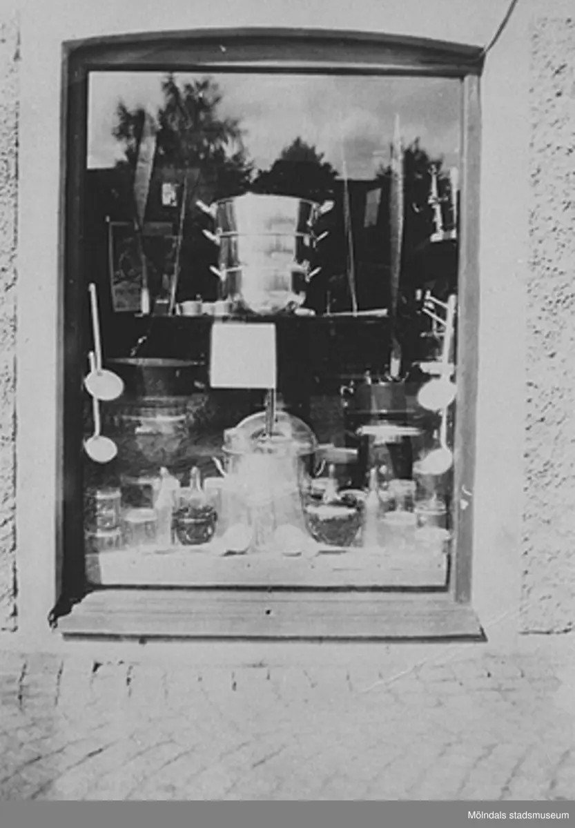 Skyltfönster med kastruller och andra köksredskap. E. & K. Karlssons järnhandel, 1920-tal.