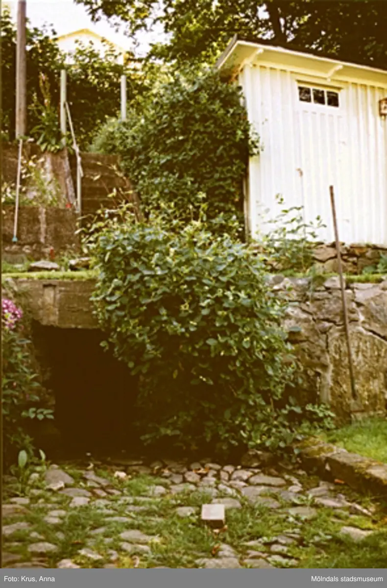 Sånglärkan 1. Detalj av trädgård - källa / trappa / uthus.