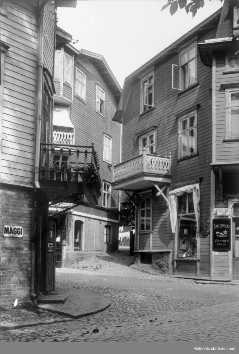 Trädgårdsgatans mynning mot Kvarnbygatan, 1920. Till vänster ligger affären "Eneborg" (Kvarnbygatan 23) och till höger ligger affären "Fridtuna" eller "Rökarns" (Kvarnbygatan 25, sedemera Sven Ahlins Herrekipering).
