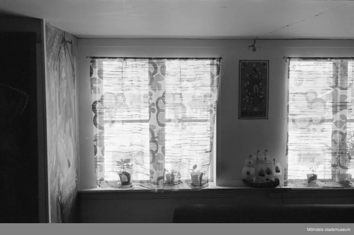 Roten M 2 i Mölndals Kvarnby. Interiör av bostad. Konstnärliga dekorationer skymtas. Fönster.