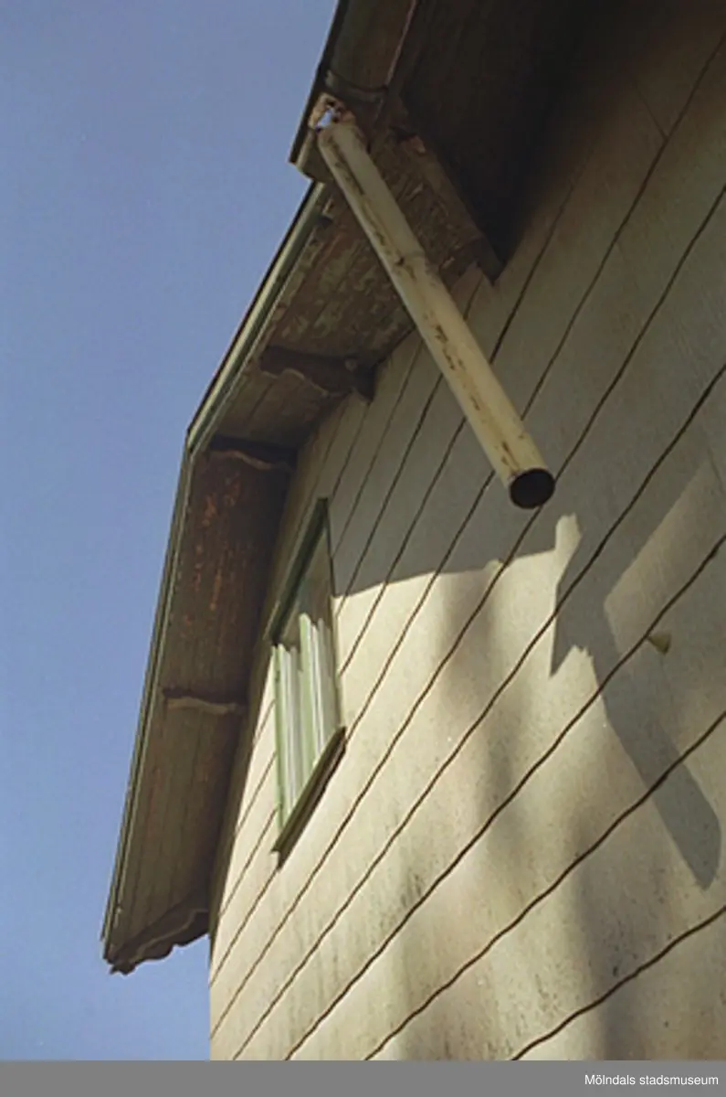 Takfot och stupränna på bostadshuset Tjädern 2, inför rivning. Vy från söder,
