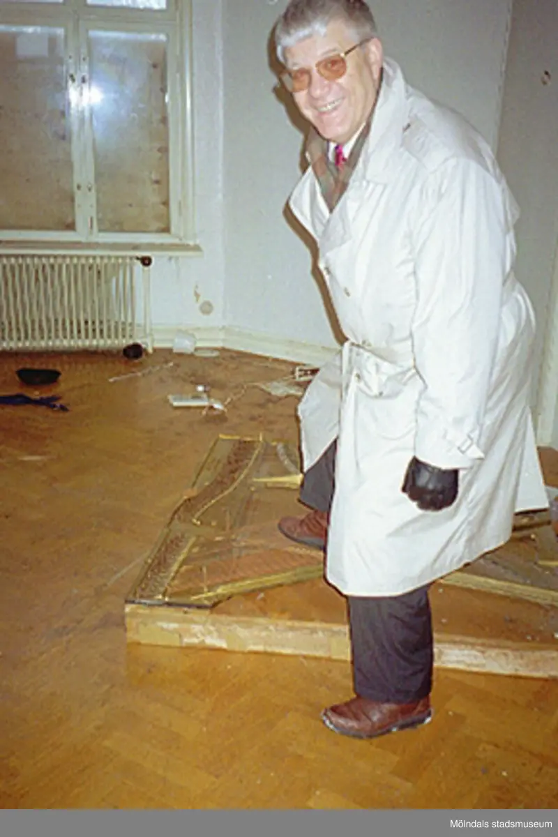 Kommunfullmäktiges ordförande Kaj Johansson ler mot fotografen, ståendes bland interiör i bostadshuset Villa Solbacken i Krokslätt, januari 1995.