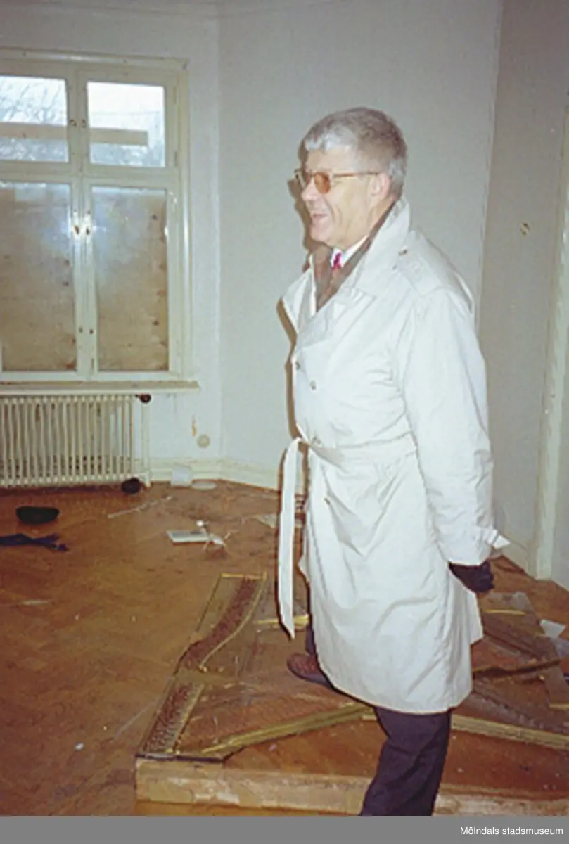 Kommunfullmäktiges ordförande Kaj Johansson, ståendes bland interiör, i bostadshuset Villa Solbacken i Krokslätt, januari 1995.